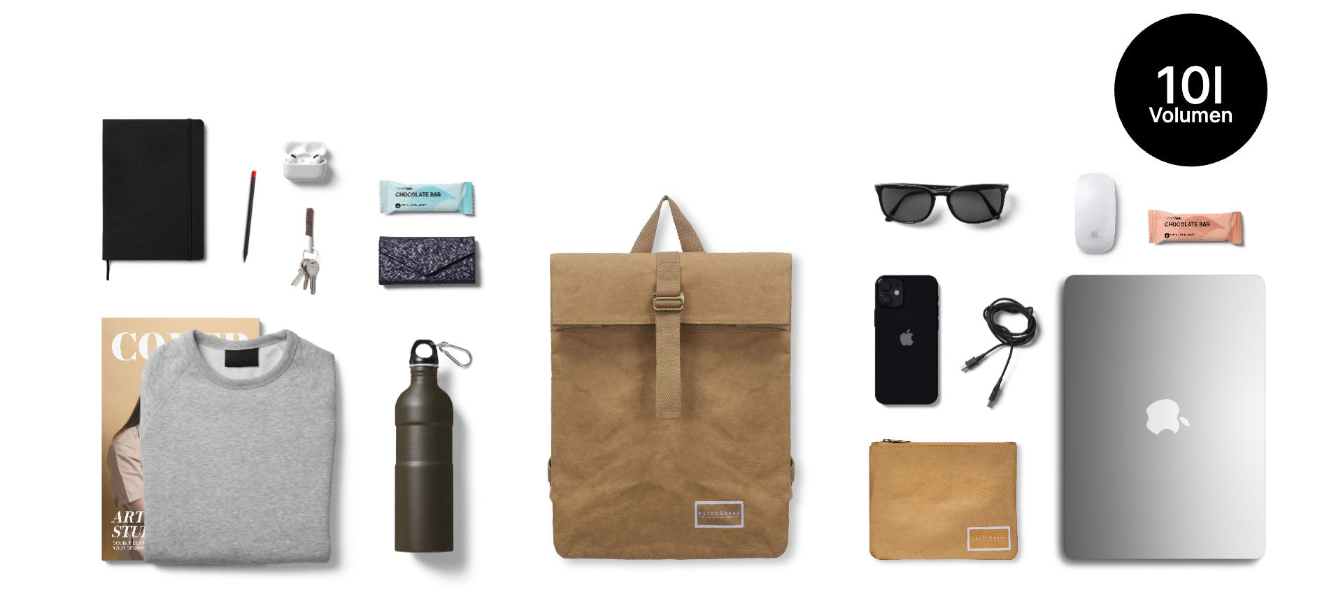 Our Oak kraft paper backpack was lovingly handcrafted and consists of durable and water-repellent kraft paper. We do not use plastics or leather in our materials and use renewable raw materials such as wood fibers and flax.